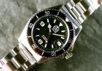 For men, diver, steel case and bracelet, mineral glass, date, black bezel,